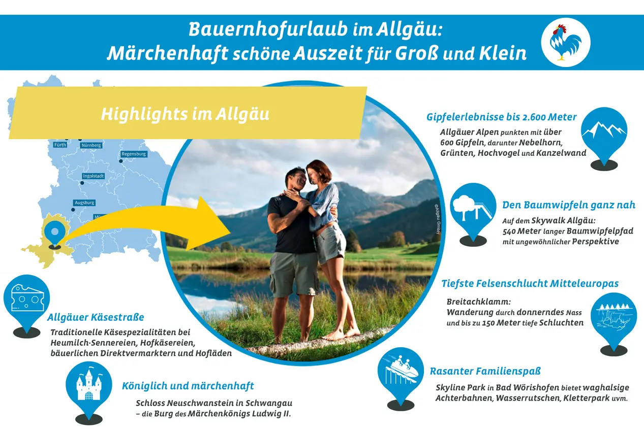 Umgeben von der wundervollen Landschaft des Allgäus mit seinen unterschiedlichen Höhenlagen bestechen die Allgäuer Bauernhöfe und Landhöfe durch ihre reizvolle Lage und die Verwurzelung mit der Natur. Urlauber erleben hier hautnah die Schönheiten der jeweiligen Jahreszeiten wie die Wiesenblüte im Frühling, die klaren Badeseen und Bergbäche im Sommer, die bunten Wälder im Herbst oder die schneebedeckten Gipfel im Winter.