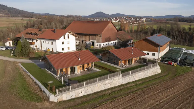 Schon beim Betreten der Chalets spürt man es: die Wärme. Den Duft von Zirbe und Fichte. Es ist das Gefühl von „Hygge“, dieser dänischen Glücksformel für Gemütlichkeit, die hier im Bayerischen Wald ein neues Zuhause gefunden hat. Die Architektur ist offen, aber geborgen. Viel Glas holt die Natur nach drinnen. In den beiden Chalets dominiert Holz. Echtes, massives Holz aus dem eigenen Wald der Auers. Im Wohnzimmer knistert der Schwedenofen gemütlich vor sich hin. Eine Couch lädt zum Lesen ein. Alles wirkt stimmig. Nichts ist überladen. „Wir wollten keinen Kitsch“, sagt Carina Auer. Sie streicht über den schweren Esstisch aus Eiche. „Wir wollten einen Ort schaffen, an dem die Seele zur Ruhe kommt.“ Die Devise lautet: einfach ankommen und tief durchatmen.